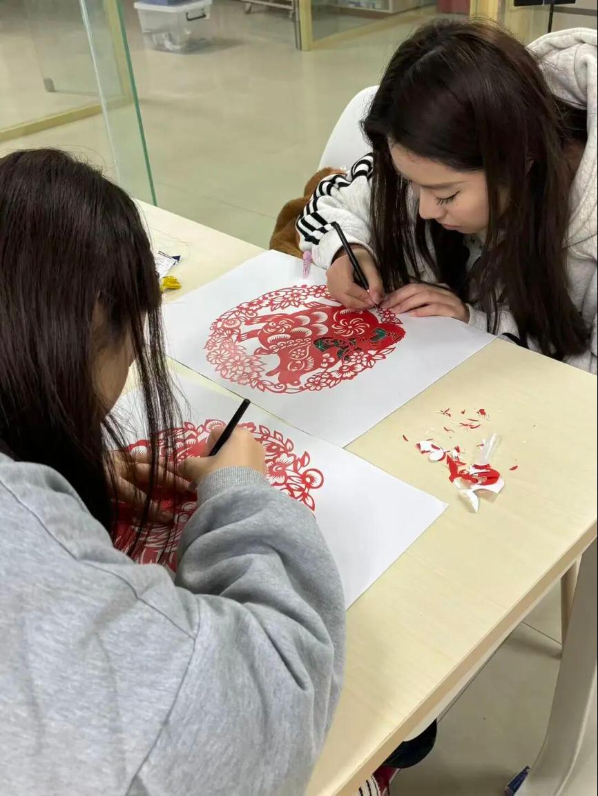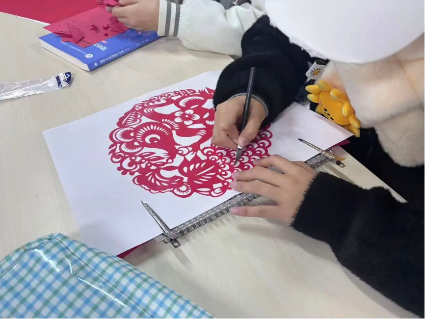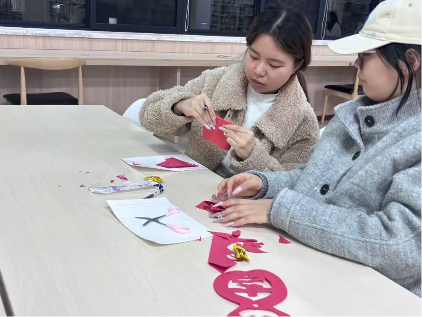 手工区的活动同样异彩纷呈。协会为参与者备齐了各类剪纸材料,从多彩的纸张到专业的刻刀,一应俱全。在个人创作区,同学们凝神静气,细致刻画十二生肖、精巧剪出春花与福字,每一刀都倾注着专注,每一剪都流露着耐心。而在团队协作区,气氛更是热烈——组员们分工明确,有的精心设计图样、简化刻制步骤,有的则专注于细节的剪刻打磨,众人齐心,共同完成了一幅幅精美的大型剪纸作品。尤为可贵的是,活动结束后,同学们主动整理工作区域,将碎纸屑清理干净,工具摆放整齐,充分展现了良好的素养与高度的责任心。